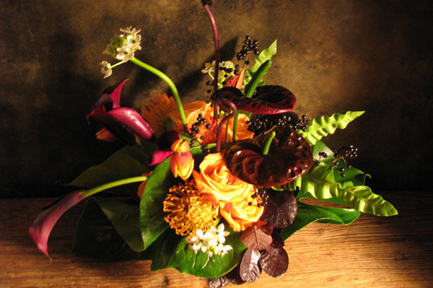 This vibrantly colored arrangement from Florisity juxtaposes large leaves with small flowers. Materials used include chrysanthemums, anthurium, star of bethlehem, fiddlehead ferns, burgundy calla lilies, orange roses, and berries.