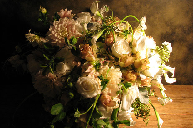 Evocative of a classic English rose garden, this arrangement from Florisity uses white roses, dahlias, calla lilies, and assorted foliage.