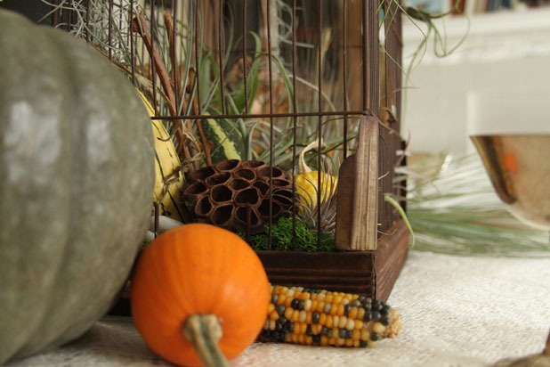 This repurposed birdcage, from Gorgeous and Green, is filled with seed pods, grasses, pumpkins and squash.