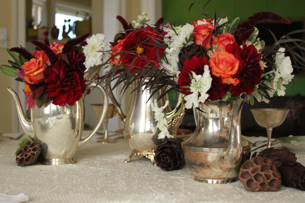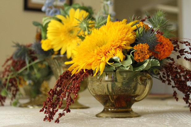 Gorgeous and Green uses glass teacups and vessels to create these beautiful orange and yellow arrangements with thistle, daisy, chrysanthemum, and cabbage.