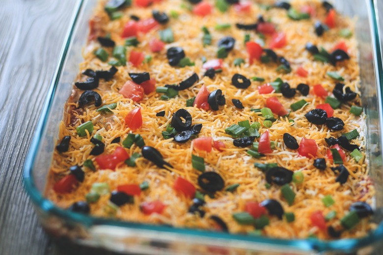 How can you improve on guac? Layer it with refried beans, sour cream and shredded cheese and top it with tomatoes, black olives and scallions for a colorful fiesta in your mouth. Honestly, people don't make seven-layer dip enough. And it's so easy. You just open a few cans and you have an instant party-ready snack.