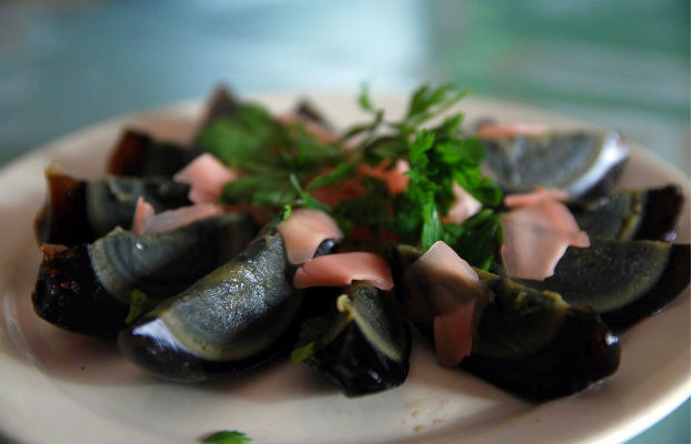 This Chinese delicacy consists of an egg, which has been preserved in clay, salt, ash, quicklime, and rice hulls for anywhere between a few weeks and several months. During this ageing period, the yolk becomes dark grey and creamy, while the white turns into a dark brown, translucent jelly.