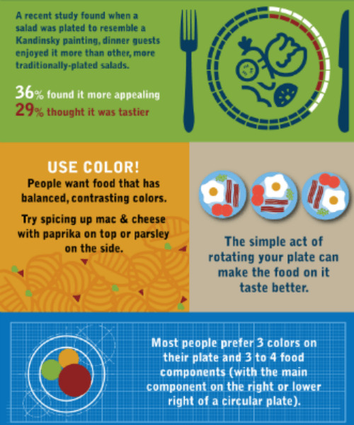 Well-plated, visually appealing food will always taste better than its inelegantly served counterpart. Using as many colors as you can in a dish will make for a more enjoyable meal, and, if you're feeling like your plating skills are up to a challenge, plating a dish to resemble a Kadinsky painting will make the food you've cooked even tastier. It's almost hard to believe that this is science and not pure magic.