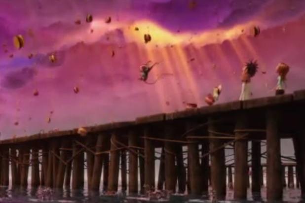 After the machine breaks down, it starts spitting out cheeseburgers in the form of rain.