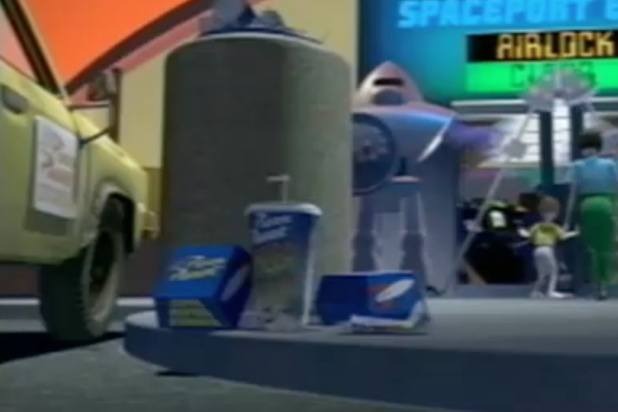 After losing Andy in a gas station, Woody and Buzz Lightyear hitchhike on the back of a pizza truck and sneak into Pizza Planet, an outer space-themed pizzeria, in order to find him.