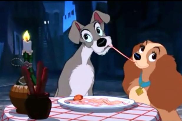 Lady and the Tramp head to Bella Notte where they "order" à la carte and get spaghetti and meatballs. The two pups kiss when they meet in the middle while eating pasta.