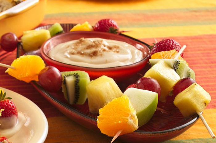 If you want to get really creative with this dip for game day, try arranging the fruit skewers to look like goal posts. Use a Styrofoam base to keep your structure upright, and let football fans pick fruit off of it at their leisure to dip into this fabulously sweet and healthy dip.