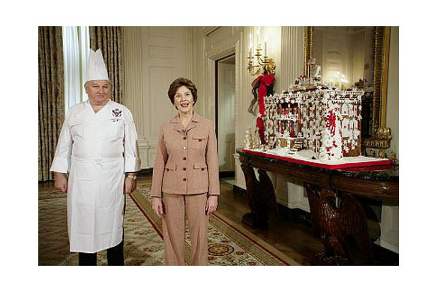 "Too much" was not in the vocabulary of those planning the menu for the 2006 White House holiday receptions. The spread included massive shrimp and cheese displays, stuffed turkey breasts, a cured Virginia ham, beef tenderloin, and lollipop lamb chops, in addition to a variety of sides from soufflés to tamales. For dessert, guests were tempted with a towering tree made of pecan sandies, a red hat box cake, a white pound cake wrapped in red marzipan frosting and tied with a red ribbon, and a chocolate Yule log with meringue mushrooms and white chocolate magnolia leaves, along with so much more.