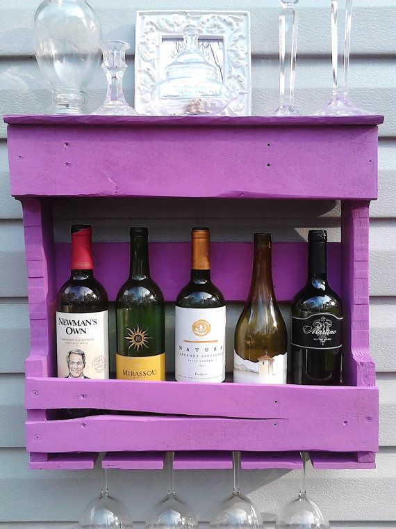 This five bottle, four glass wine rack is made from recycled pallet wood and is painted in Radiant Orchid. Perfect for a funky kitchen or chic host!