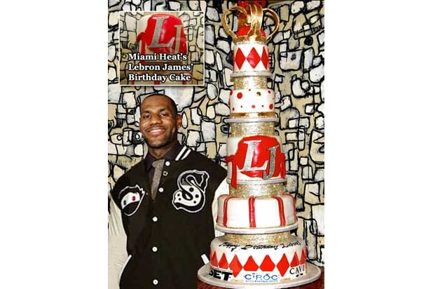 Miami Heat guard Dwyane Wade with his 29th birthday cake and teammate LeBron James.