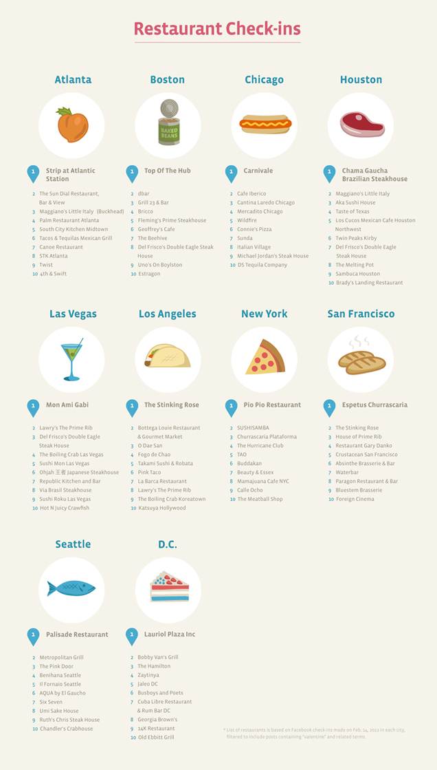 Just in case you're still scrambling for ideas for Valentine's Day (seriously? Get on it), Facebook has launched a set of infographics showcasing the top 10 restaurants with the most check-ins on Valentine's Day. Thankfully, there aren't any White Castles.