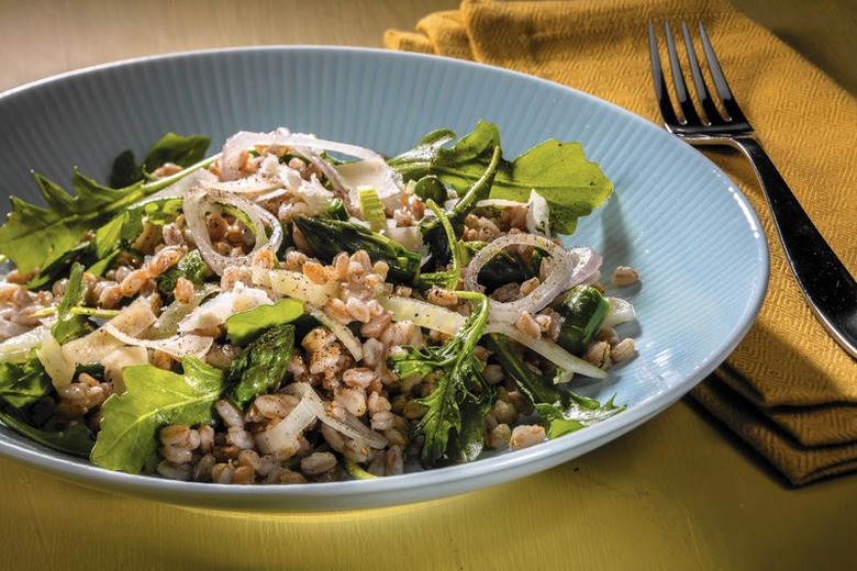 - Step 5: Scrape cooked farro into the serving bowl and toss. Let rest, 10 minutes. Add 4 ounces arugula and toss. Add salt if you like. Using a vegetable peeler, carve on curls of Parmesan. Enjoy at room temperature.