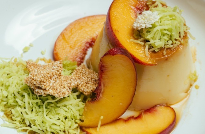 Tiajuana chef Javier Plascencia, whose numerous restaurants include Misión 19 and Villa Savieros in his hometown and the new Bracero Cocina del Raiz in San Diego, creates his flan napolitano for Bracero by slowly boiling sugar and water until it turns into sweet, gooey caramel, then combining cream cheese and milk and baking the confection until it produces a custard that’s bursting with flavor. To top it off, Plascencia adds orange zest for increased flavor, giving his version of the dish a unique taste that sets it apart from those of other restaurants in the area. At the end, slices of peach bring out the great orange flavor in the flan!
