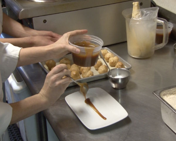 - In a medium saucepan over medium-high heat, combine the sugar and water. Swirl the pan (do not stir) until the sauce is just beginning to turn amber. Whisk in the cream. The sauce will bubble up a lot, so be careful. Quickly remove from the heat and whisk in 2 ounces of the foie gras base. The sauce can get dark very fast, so have a bowl ready to pour the sauce into. Set aside and let cool at room temperature. If the sauce separates at all, simply whisk it some more and it will come back together. The caramel sauce may be stored in the refrigerator for up to 1 week; let it come to room temperature before using.