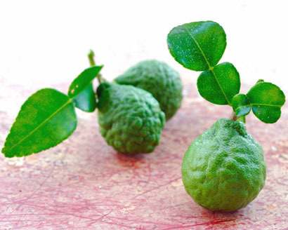 kaffir lime, n.— A small, rough-skinned, very tart lime fruit, native to Southeast Asia, Malaysia, and Indonesia. The leaves of the small tree on which it grows are probably more widely used in cooking than the fruits. They certainly are in America, where the leaves are popular in Thai cooking. But the skin of the fruit also winds up in the dishes on that region, particularly in curries. The leaves are unique: they look like one leaf growing out of the end of another. The give off an interesting oil that adds an aromatic quality to dishes it flavors. The word "kaffir" is an ethnic slur in South Africa, and some would like to see another name used for this lime and its leaves.