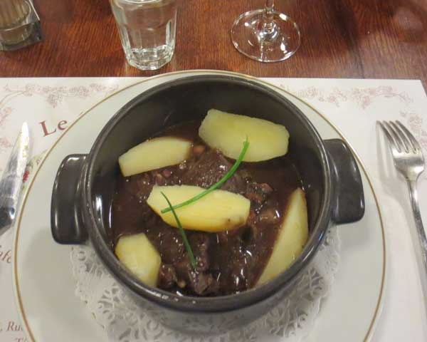 Beef stew is a close relative to the French dish beef bourguignonne. Other than the inclusion of wine in the recipe, the principal difference between beef stew and beef bourguignonne is about five dollars per serving.