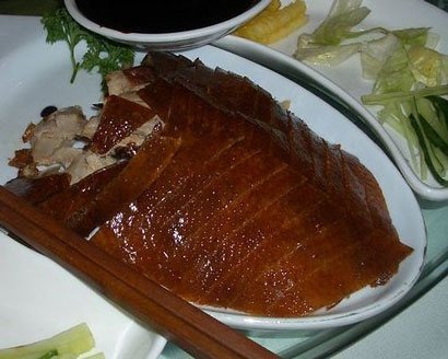 When it comes out of the oven, the chef presents it grandly on a platter at the table. After a round of ooohs and aahhs, the chef returns to the kitchen to cut the ducks up, separating the skin from the meat. It returns on the platter with some green onions and hoisin sauce. You roll all of that in a "pancake" (like a soft, thin flour tortilla) and eat it with the fingers, like a burrito. The best I've had locally was at Cafe East, where not only do they present the duck as just described, but with an additional stir-fried dish with vegetables and the miscellaneous parts of the duck. It's a meal in itself.