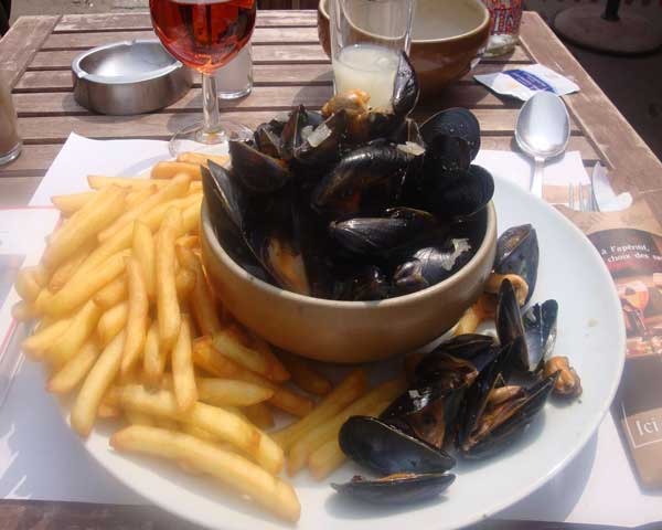 moules et frites, French, n., pl.– Literally, mussels and French-fried potatoes, in the style of the French bistro. The implication of that formula is that the mussels will have been cooked in a brothy sauce of white wine, the mussel juices, herbs, and shallots. The fries are traditionally served atop the mussels in their large bowl. It's always seemed to me that this presentation makes the fries lose their crispness. Usually an aioli comes on the side for dipping the fries; that is a very good idea. Moules et frites are equally good as an appetizer or entree.