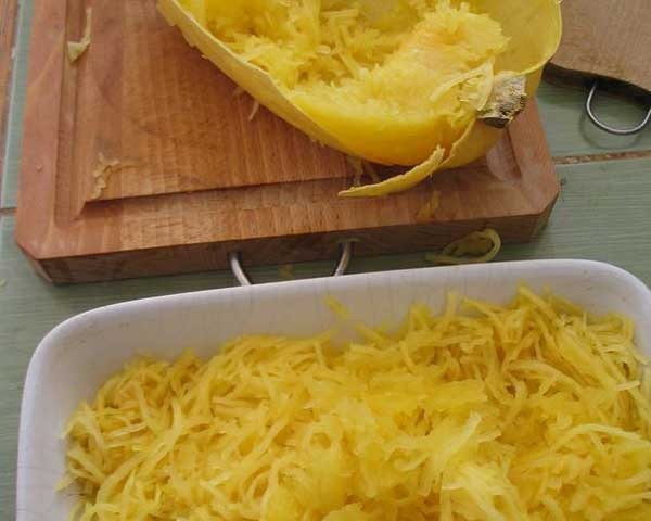 spaghetti squash, n.–A variety of the familiar curcurbit squash family, native to America. What makes it unusual is that the thin layer of fiber that separates the seeds from the meat in most squashes is greatly expanded in the spaghetti squash, so that it fill most of the vegetable. Raking the inside of a cooked spaghetti squash easily pulls these fibers apart into what looks for all the world like a tangle of yellow angel-hair pasta. It doesn't have a lot of flavor, but that can easily be remedied with garlic, butter or olive oil, herbs, salt and pepper. Then it becomes a delightful side dish, high in fiber and low in everything else.
