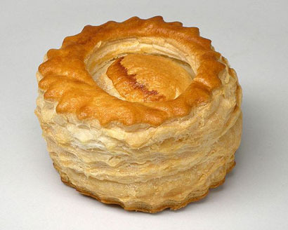 In New Orleans, vol-au-vents are most often made into a dish called oyster patties–little vol-au-vents filled with oysters in thick sauce, baked a little more to make them crusty. Nine out of ten of these are terrible, usually because the the sauce is too thick. In the hands of a skillful chef, however, vol-au-vents can be fantastic. The best I ever had was a sweetbreads and mushroom dish made by Chef Denis Rety at the short-lived but brilliant Le Chateau in Gretna. The vol-au-vent was about five inches across and three inches deep, and was delicious enough to compete with the goodness of the creamy sauce and rich sweetbreads. You'd never know it was a close cousin to the gross little oyster patties forced upon you at wedding receptions.