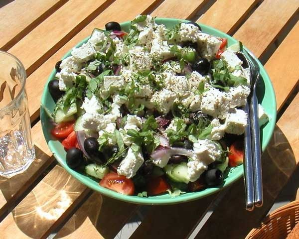 A really great Greek salad will still have a few chunks of feta cheese and a few olives remaining after all the greens have been eaten.