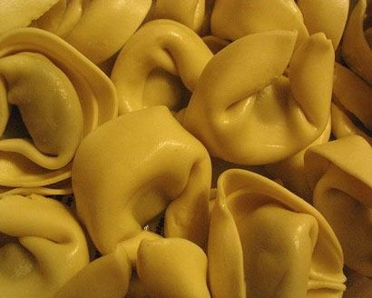The buzz on the Web is that today is National Tortellini Day. Tortellini come from the Emilia-Romagna region of Italy. They're small ravioli–little pillows of pasta usually rolled up around the stuffing instead lying flat. The filling is most often cheese, but spinach, tomatoes, basil, mushrooms, or other fillings–more often vegetable than meat–can be enclosed in tortellini. A slightly large variation is called tortelloni, which no doubt has its own special day. My favorite tortellini (or tortelloni) dish is a salad Chef Ron Wilemon of Allegro Bistro made at a party once. I badgered him for the recipe, and I have it below, in the Recipes department.