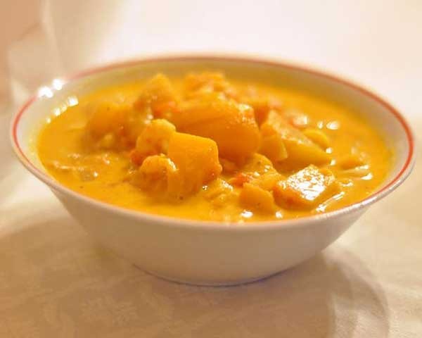 It's National Curry Day. In America, curry is one of the most misunderstood of food concepts. A curry does not necessarily (and probably doesn't) have the flavor of curry powder, with its powerful flavors of cumin and turmeric. The word "curry" originated in the Tamil language, as the name for a dish cooked with a spiced sauce. That admits of an enormous variety of dishes, with such a wide spread of flavors that the word "curry" becomes as generic as "stew" or "soup." A good Indian restaurant will have dozens of dishes that they'd call curries, each with its own distinctive ingredients and flavor.