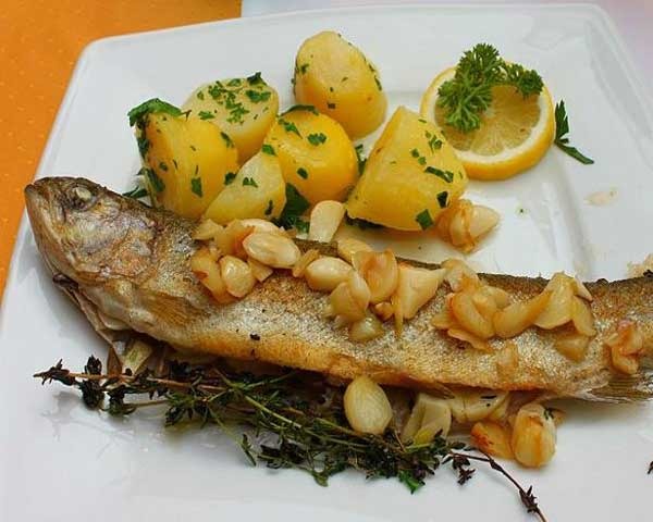 There are good ways to prepare trout, and less good ways. The standard method, at trout specialists like Galatoire's and Arnaud's, is to deep-fry it. Or, if you're being elegant, to pan-saute it–a variation on frying, really. Trout also comes out nice when baked, particularly underneath a modest topping. These run the gamut from seafood and bread crumbs to shredded potatoes to toasted almonds or pecans. Although sometimes trout is grilled, I think it's not as good as other fish for that purpose. Its flaky structure seems to fall apart on the grill.
