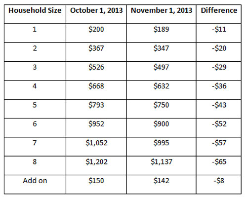 Translated to benefits, this means a single-person household receiving the maximum benefit of $200 a month will receive $189 a month, an $11 difference. A two-person household will receive $20 ($347 instead of $367) and so on. The minimum benefit payment of $16, in the meantime, will decrease by $1.