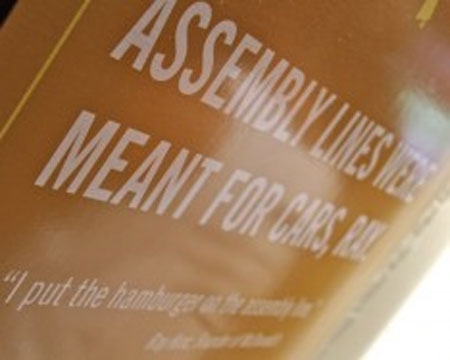 Good Stuff Eatery there's a sign with two quotes on the wall opposite the registers. The first from Ray Kroc of McDonald's, "I put the hamburger on the assembly line." The second, at least ostensibly, is from Spike, "Assembly lines were meant for cars, Ray." It's a little disingenuous.