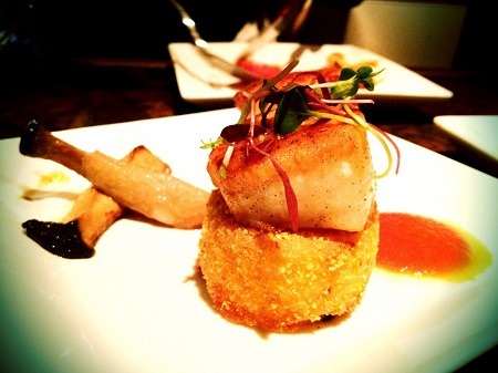 Diver sea scallops with polenta cakes and trumpet mushrooms