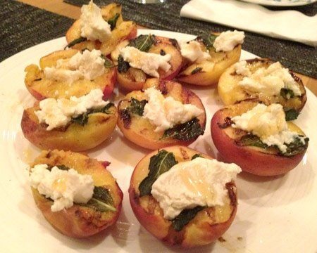 - Preheat a gas grill on high heat until very hot. Place 1 large mint leaf on top of each peach half. Grill both sides of the peach until the peach is warm and there are char marks on both sides. Immediately place a dollop of goat cheese and a drizzle of honey on the peaches and serve warm.