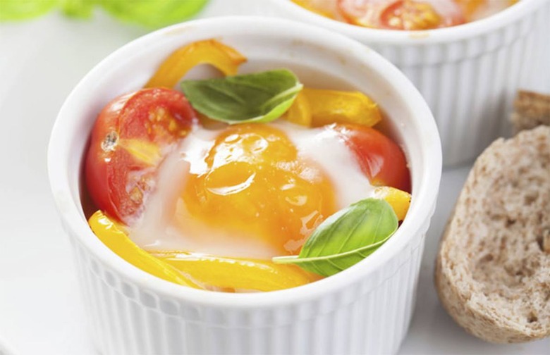 Roasting cherry tomatoes on low heat brings out their natural sweetness, making them an excellent accompaniment to savory eggs. The eggs, which are cooked in ramekins, are finished with a dollop of goat cheese. Click here for the recipe.