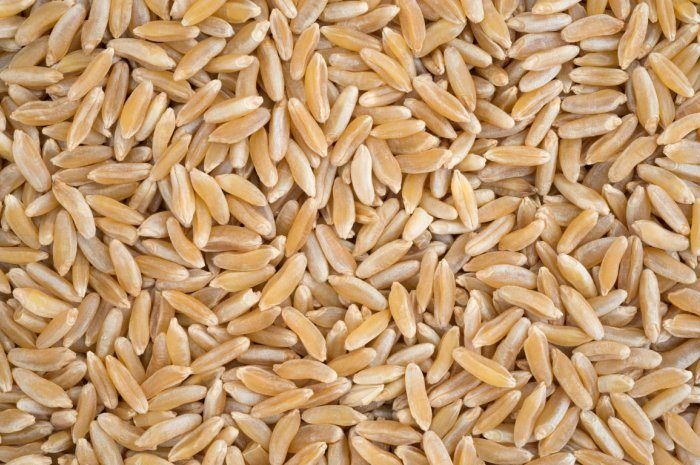 Khorasan wheat was most likely one of the earliest cereal crops domesticated by humans, but now it is more commonly associated with its trademarked brand name, Kamut. The ancient grain is larger than traditional wheat and nuttier in flavor. A cup of cooked Khorasan wheat has only 1 ½ grams of fat and 230 calories, but provides 28 percent of the recommended daily intake of fiber and 10 grams of protein.