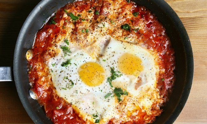 Eggs can be eaten for more than just breakfast and brunch. The eggs take center stage in this savory Mediterranean dish that uses paprika, cumin, garlic, and chopped tomatoes. The eggs are cracked on top of a bed of tomato sauce and are quickly broiled to maintain the luscious consistency of the yolk.