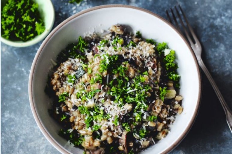 The heartiness of a rugged grain like barley paired with the earthiness of mushrooms is a satisfying meal that can be served as a side or main course. Thyme, garlic, shallots, and Parmesan add another level of umami to the dish.