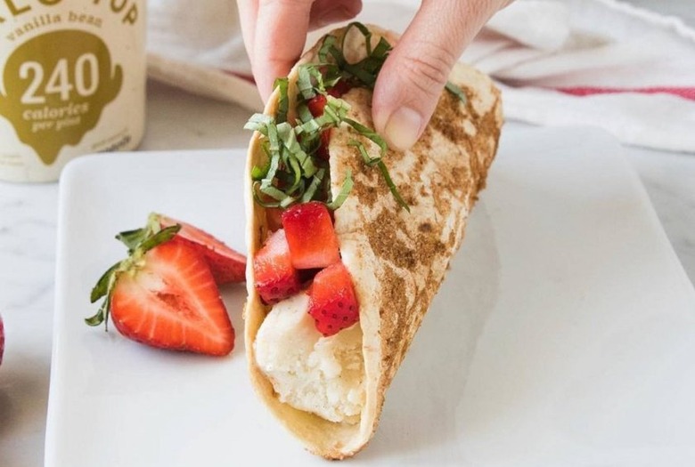 I know, I know — two foods you thought never could be healthy, meshed into one nutritious dessert. Too good to be true? Not this time. The recipe uses low-calorie Halo Top ice cream in a fluffy oat and flax tortilla. The eggs in the recipe add some protein, and since they're only sweetened using Halo Top and fresh fruit, the sugar content of these sweet snacks is crazy low.