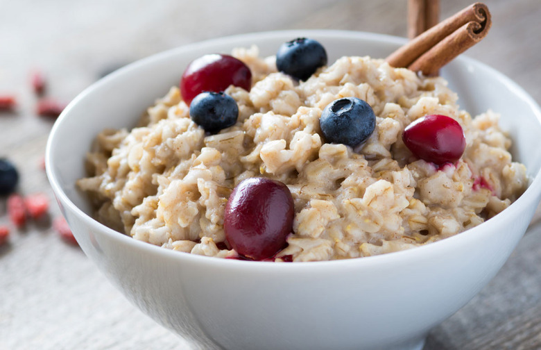 Once your oats are cooked, place either one-half cup or a full cup (how hungry are you, beloved reader?) of piping-hot oats into a bowl. Let them sit to cool a bit. During this time, choose a healthy fat to add. If you're looking to make these oats similar to a peanut butter oatmeal cookie, the clear healthy fat choice would be natural peanut butter. If you desire a less flavorful fat, coconut oil should be your go-to. Regardless of fat choice, stir in two tablespoons of it into your cooked oats after waiting seven minutes. The oats will still be fairly hot, allowing the fat to act as a thickening and binding agent.