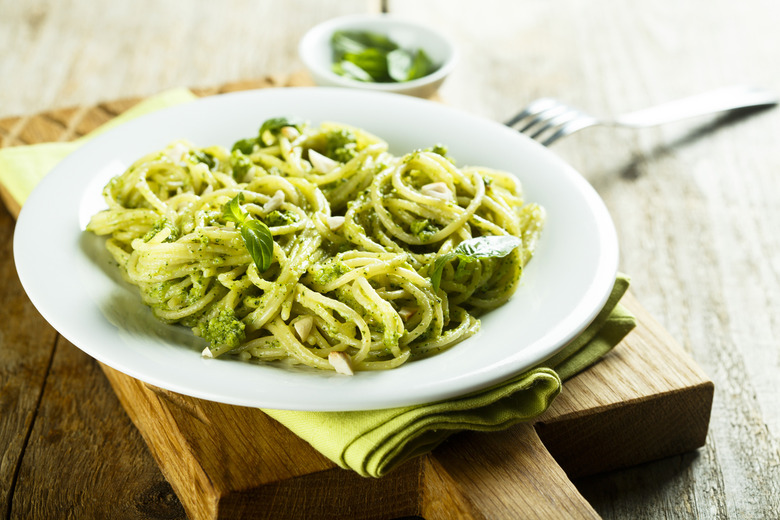 Reasons to eat more pesto: One, it's the best-o. Two, it has a ton of garlic. It uses raw garlic, too, meaning the benefits of eating it are at their peak. Make your own at home if you're feeling adventurous or just buy some pre-made. It goes great with a healthy pasta dish — the perfect way to switch it up from using boring old red sauce!
