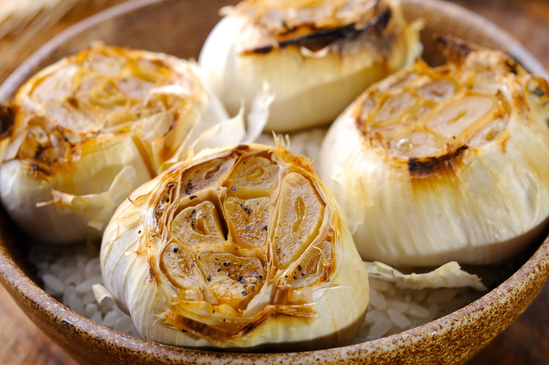 Garlic takes a while to roast all the way through, but doing so will tone down the cloves' sharp, specific flavor. A clove of roasted garlic tastes rich and mild enough to actually eat on its own — something you'd never dare do with a raw clove. Potatoes take approximately the same amount of time to roast to a nice texture. So if you're roasting potatoes — regular or sweet — add a few cloves of garlic to the pan wrapped in tin foil and doused in oil. You can use these roasted cloves in other recipes or as easy ways to add flavor to another dish.