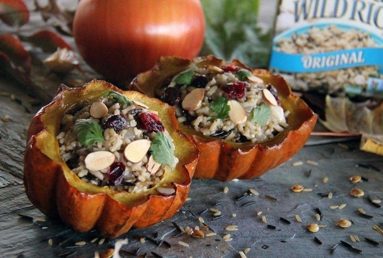 Acorn squash are perfectly sized for individual portions — slice them in half and you've got adorable, fall-themed bowls. This recipe packs five different types of vegetables in each portion; paired with brown rice, the result is a meatless meal that's as filling as it is good for you.