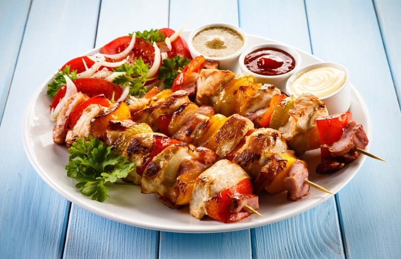 One skewer has a serving of chicken and a serving of vegetables — so as long as you limit your portion to one or two sticks, you're all set so far as your diet is concerned.