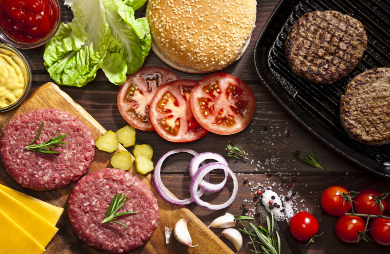 Ah, the cheeseburger: a calorie-laden classic. A typical hamburger patty averages 260 calories with 90 percent lean meat. To keep the count down, buy a lower-fat cut of ground beef before grilling. The lowest fat content for burgers is 96 percent lean — but be careful! Family members may be able to taste the difference.