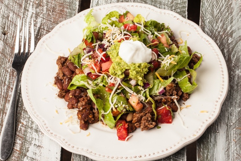 Taco salads tend to be more tortilla chip than health food, but this nutritional imbalance is easily rectified by swapping out the taco bowl for lettuce, baby spinach, or kale. Use extra-lean turkey cooked down with salsa for an easy-to-assemble salad. Add any additional vegetables or grains to add some depth to the salad.