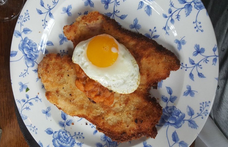This Irish pub sells lots of Guinness, but that may be the only (shockingly) healthy item on the menu. They're all fried, battered, and soaked dishes — but perhaps the heaviest was the Schnitzel Savvy. It's a huge slab of breaded and fried meat, a layer of greasy ham, bacon-filled baked beans, and a fried egg. To add insult to injury, this fried mountain of saturated fat comes with a side of fries and a sad cluster of oil-soaked arugula. At least they added greens?