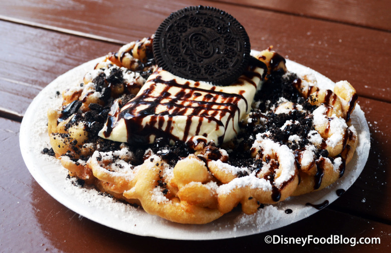 Completely personalized funnel cakes are all you'll find at this "snack cart." However, we're more inclined to call this trough of sugar a dessert rather than your average snack. The deep fried, powdered-sugar-coated dough is further coated with syrups and chocolate — but not before they throw an entire brick slab of dense ice cream on top. Don't think that's enough? Don't fret: An Oreo provides the pile with an excessively sugary finish.