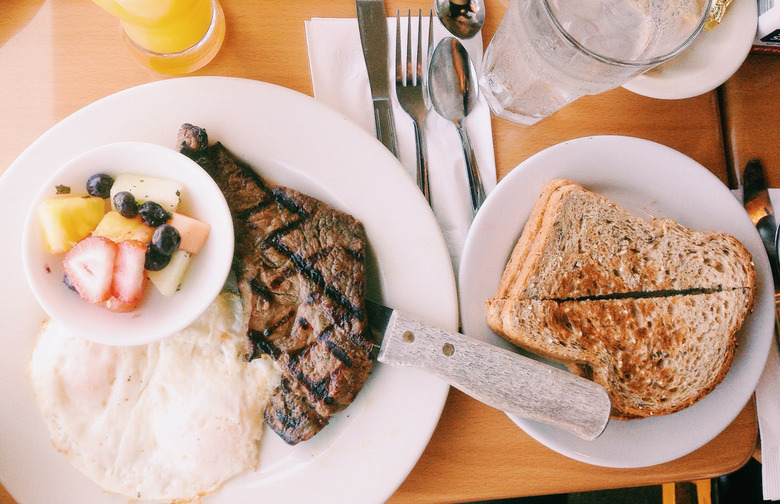 You can still enjoy your pancakes or waffles, but instead of having three or four pancakes, have one pancakes (the size of a CD) and an egg. This way, the egg will give you protein, which can prevent you from overeating later. If you have the option, try to make or order whole grain or whole wheat pancakes or waffles and use fruit as a topping.