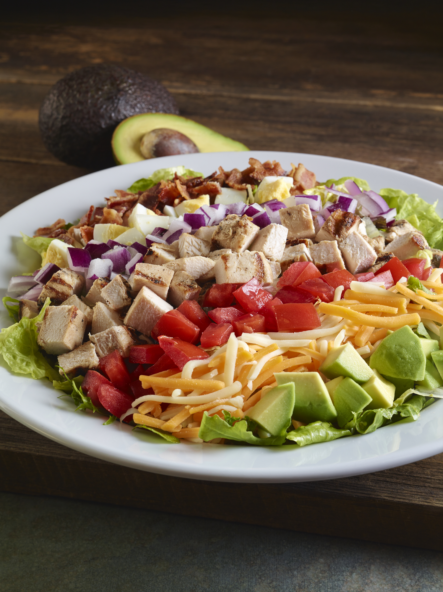 If you're looking for a more substantial meal, there's the Cobb salad, with mixed greens topped with grilled chicken, avocado, tomatoes, red onions, egg, smoked bacon, Monterey Jack and Cheddar cheeses, and balsamic vinaigrette.