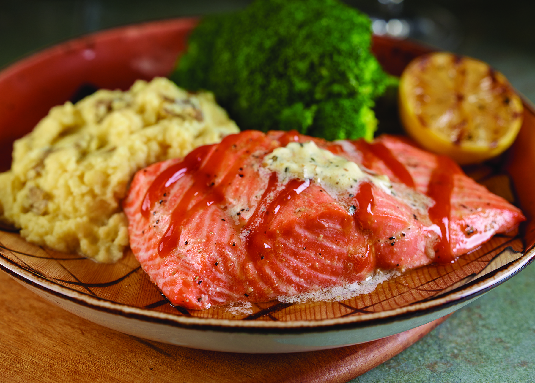 There's also the grilled Norwegian salmon topped with herb butter and served with Yukon Gold mashed potatoes and string beans.