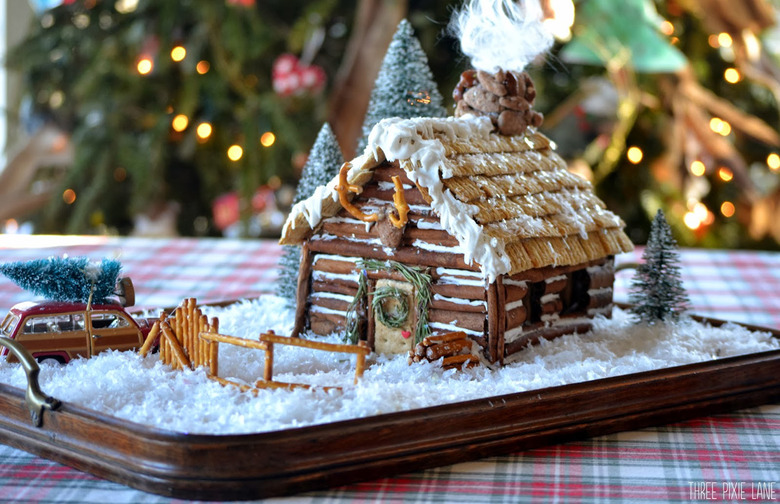 This log cabin uses pretzels to create a fence, a woodpile, and moose antlers above the front door. With a little car pulling up with a Christmas tree strapped to the top, this gingerbread log cabin looks like the perfect place to spend Christmas.